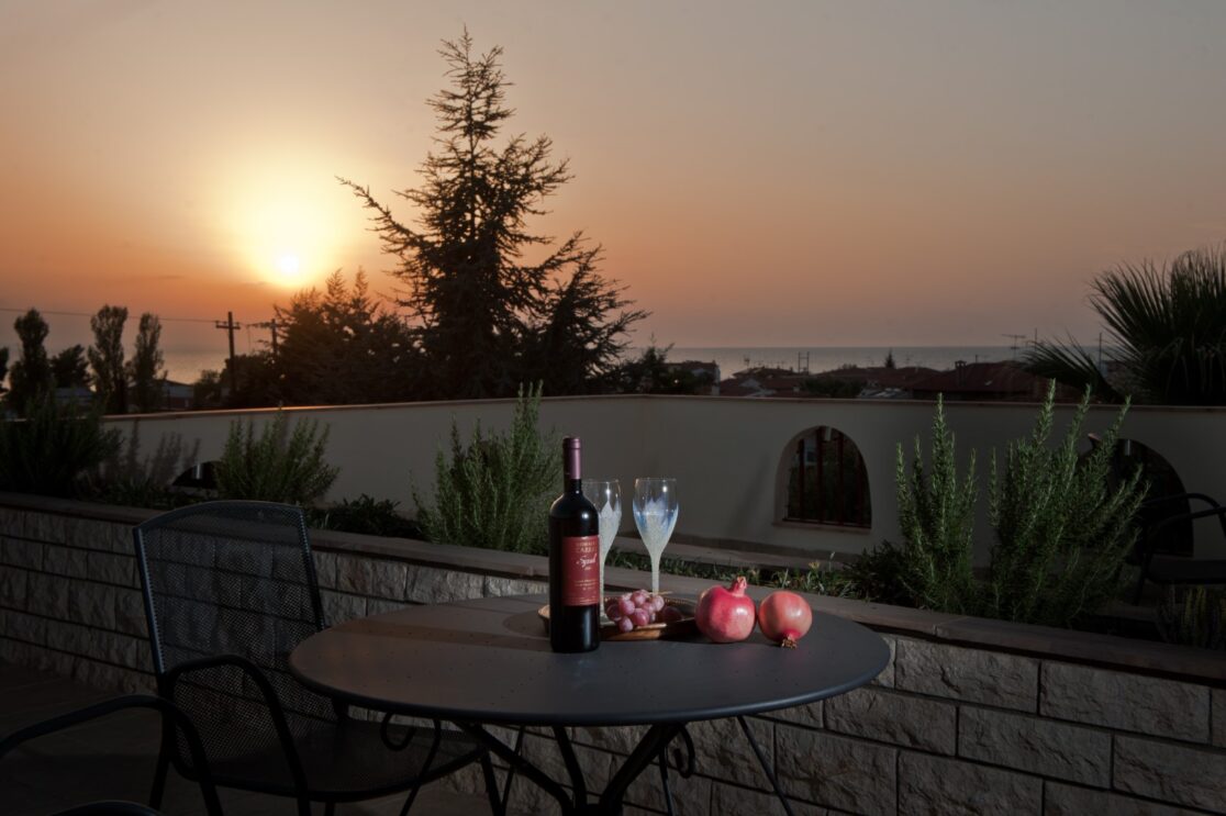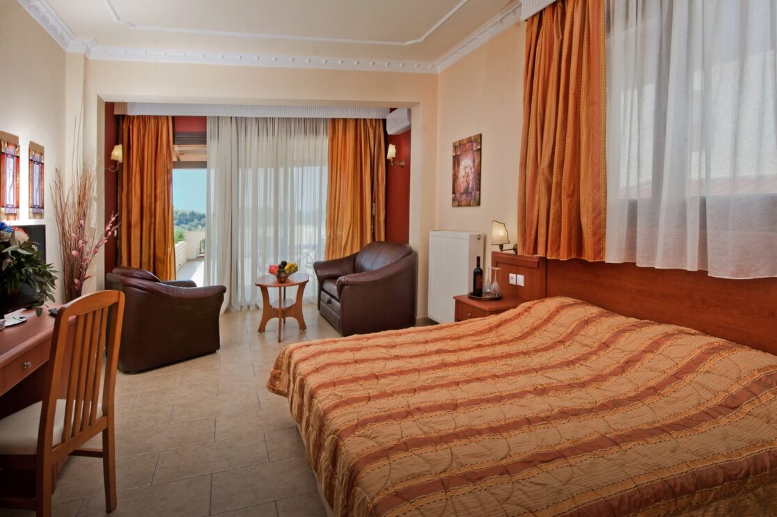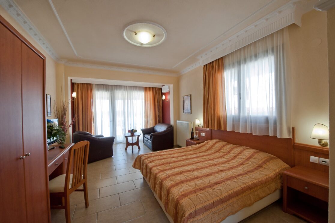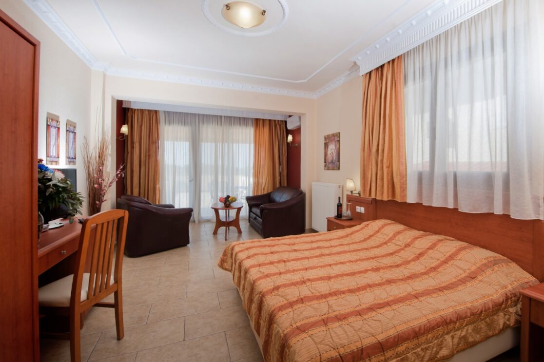 It offers all of the modern amenities such as Air Condition, SAT TV and Free Wi-Fi. The Kitchenette is equipped with utensils, refrigerator, coffee maker, electric kettle and microwave. Also a bathroom with shower, hair dryer, towels & toiletries. This suite is located on the 2nd floor of our unit and has a big balcony with an exceptional view to the area of Paradisos and the Toroneos Gulf.